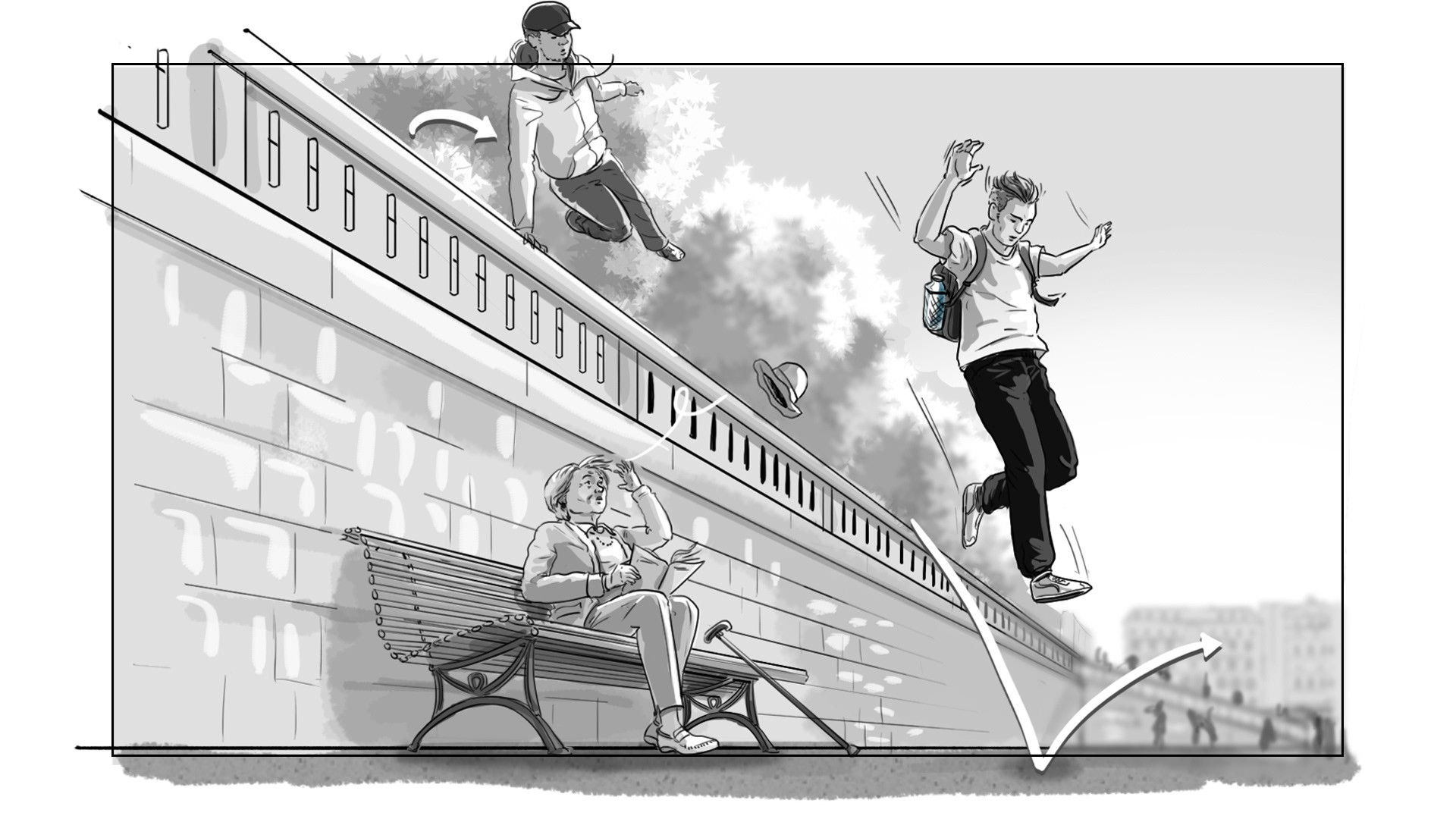 Original storyboard around a consumer product. B&W rendering with key actions.